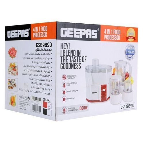MULTIPURPOSE 4-IN-1 FOOD PROCESSOR - Take the hassle from food prep with the Geepas 600W Food Processor. Juicer, Blender, mill, mixture all 4-in-1. . Comes with wealth of attachments: mixer, juicer, blender and a coffee mill to cope with everyday task